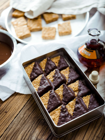 - Once cooled, cut into pieces of the desired size and dip one half of each cookie in the chocolate icing or sugar glaze.